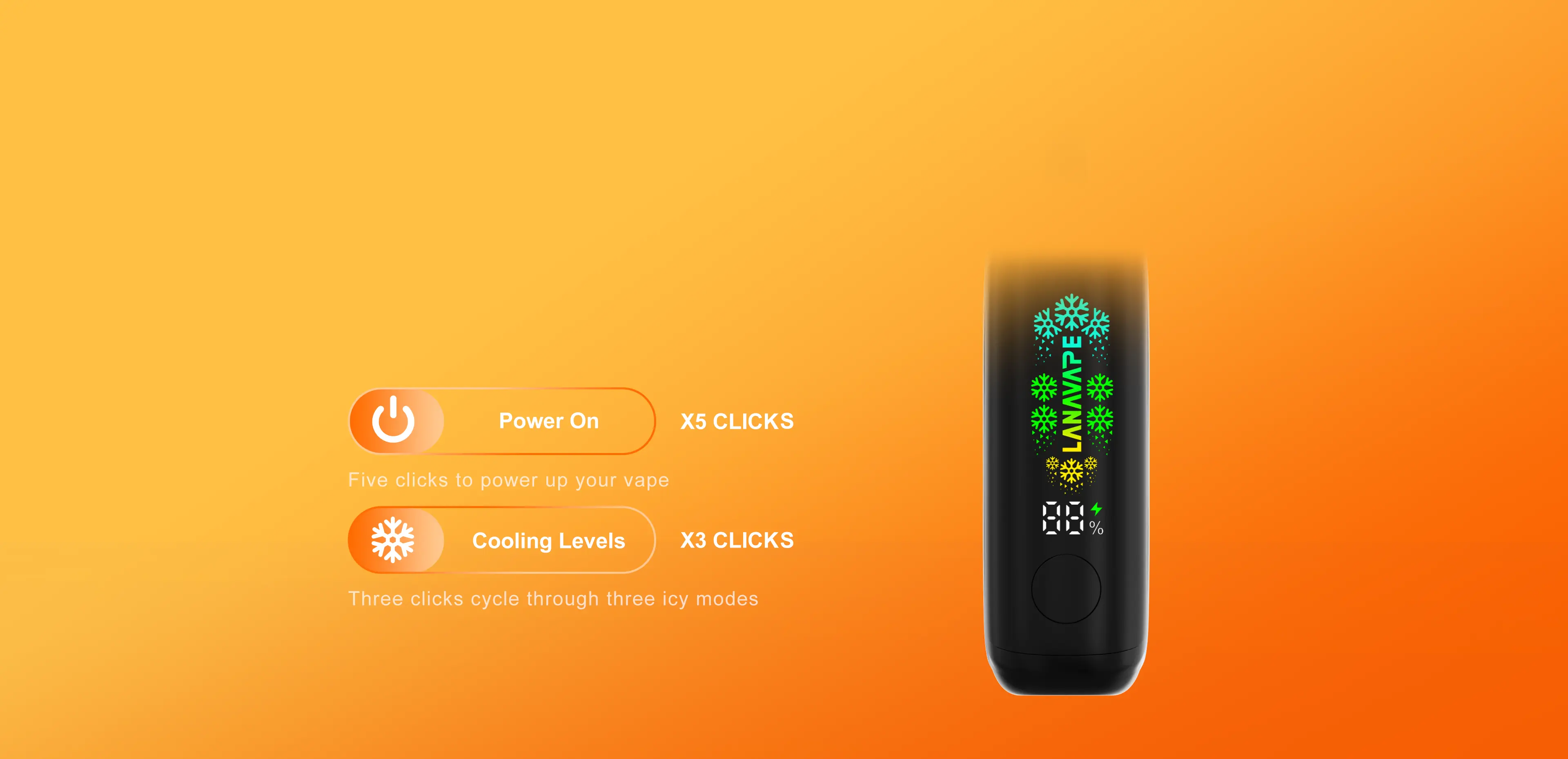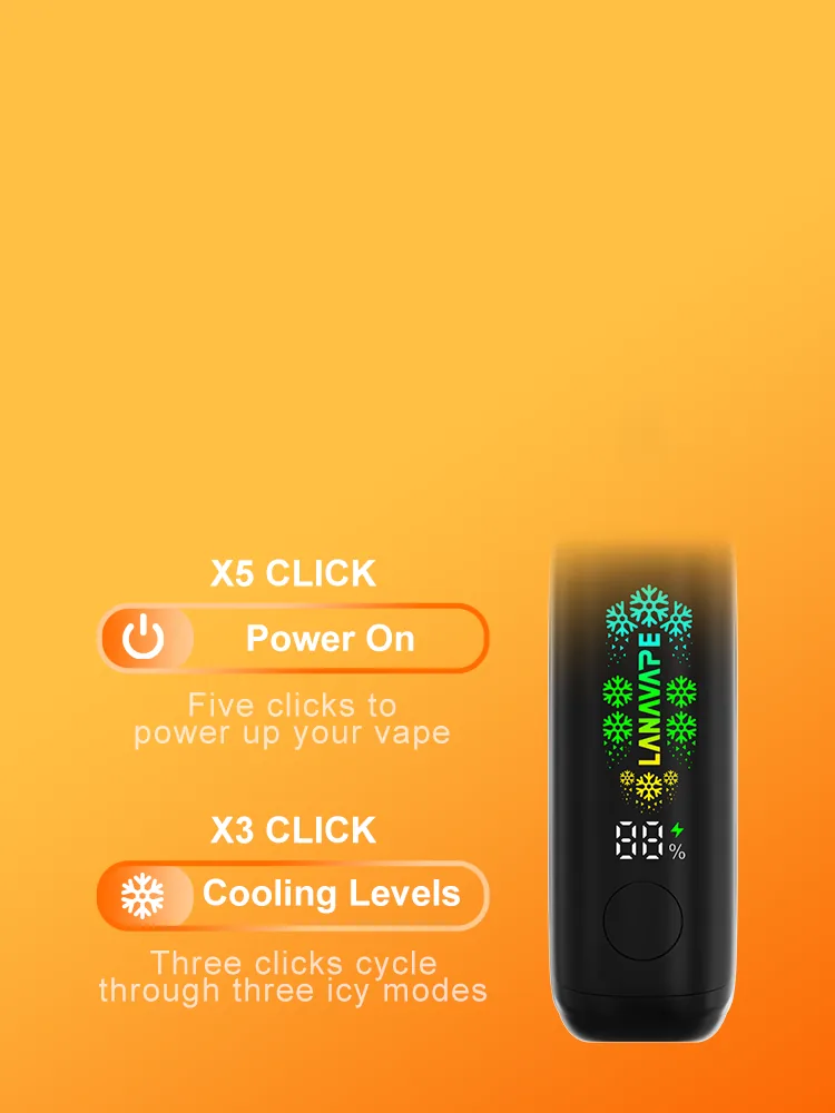 Five clicks to power up your vape-this simple sequence ensures hassle-free activation and prevents accidental starts. Three clicks cycle through three icy modes. Whether you want mild refresh or intense chill, the one-button system delivers your perfect hit instantly.